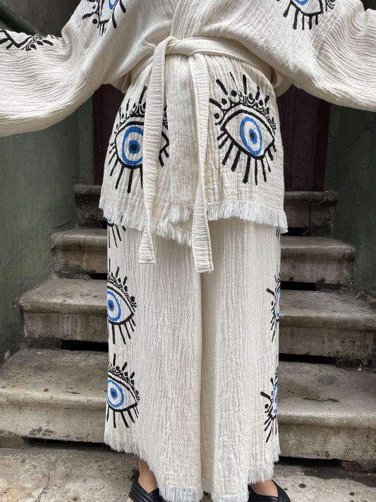 Göz Desenli Bohem Kadın Yoga Doğal Kumaş Kimono Takım Yoga Takımı