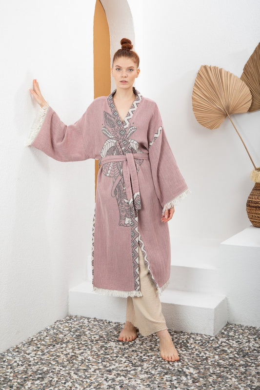 Gül Kurusu Bohem Kadın Fil Desenli Doğal Kumaş Kimono Bornoz Kaftan