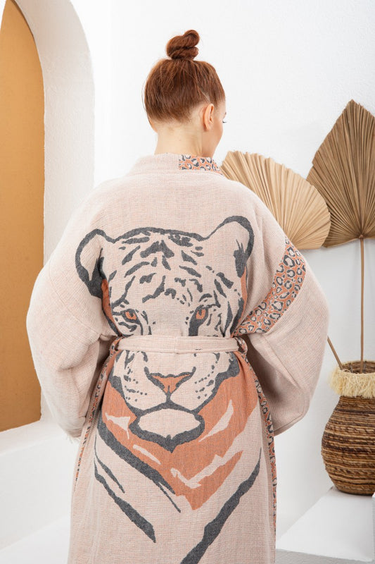Soft Turuncu Kadın Kaplan Desenli Doğal Kumaş Kimono Bornoz Kaftan