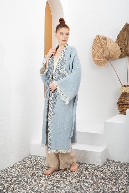 Mavi Bohem Kadın Fil Desenli Doğal Kumaş Kimono Bornoz Kaftan