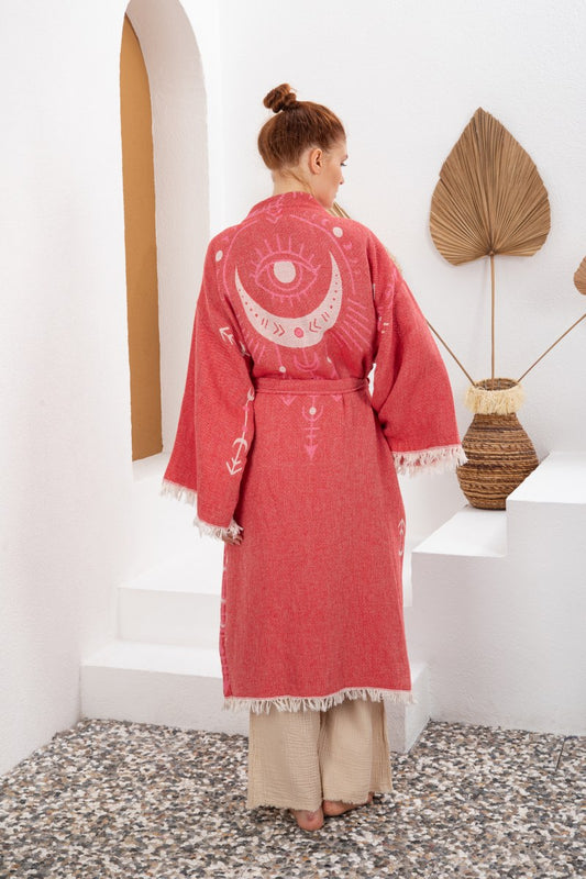 Soft Kırmızı Bohem Kadın Göz Desenli Doğal Kumaş Kimono Bornoz Kaftan