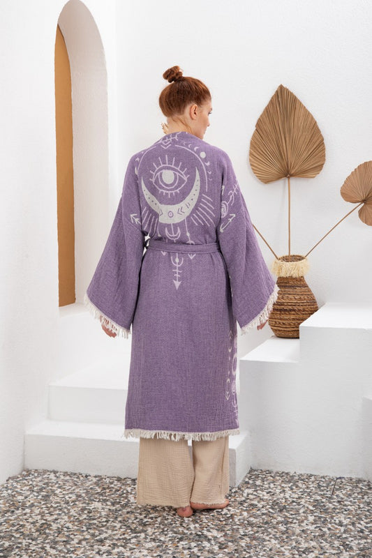 Açık Mor Bohem Kadın Göz Desenli Doğal Kumaş Kimono Bornoz Kaftan