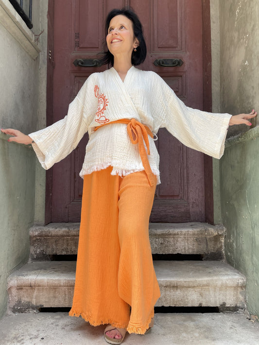 Güneş Turuncu Bohem Kadın Yoga Doğal Kumaş Kimono Takım Yoga Takımı
