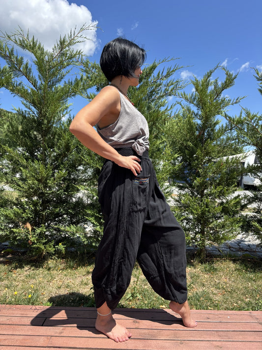 Bohem Lastik Bel Renkli Cep Siyah Kadın Pantolon
