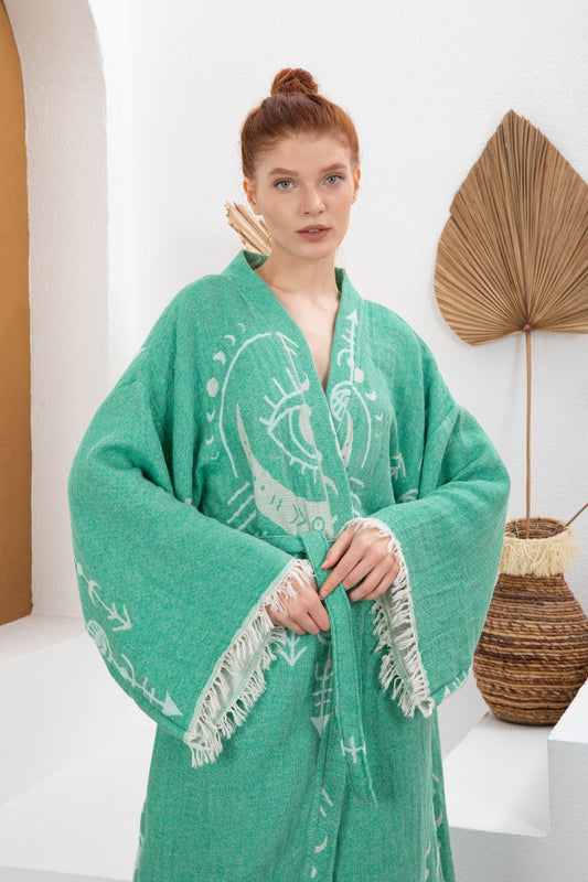 Soft Yeşil Bohem Kadın Göz Desenli Doğal Kumaş Kimono Bornoz Kaftan