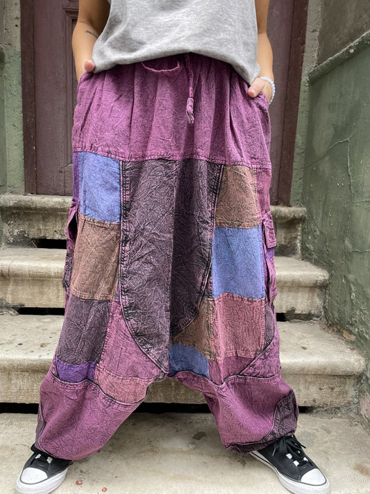 Kadın Nepal Mor Patchwork Şalvar Pantolon – Taşlanmış Kumaş, Bol Cepli, Salaş & Bohem Stil