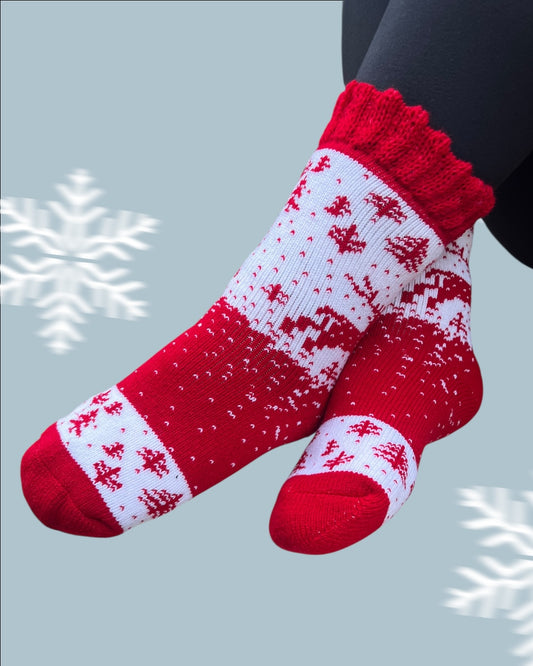 Kalın Yün Kadın Yılbaşı Çorabı – Ev Desenli, Sıcak Tutan Kışlık Çorap