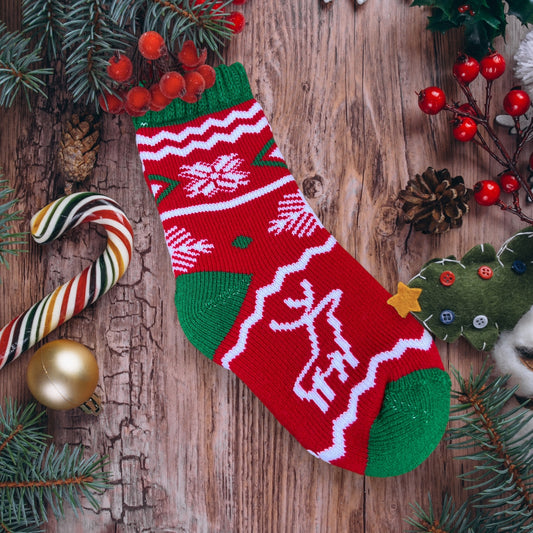 Kalın Yün Kadın Yılbaşı Çorabı – Geyik Desenli, Kırmızı Yeşil Kışlık Çorap