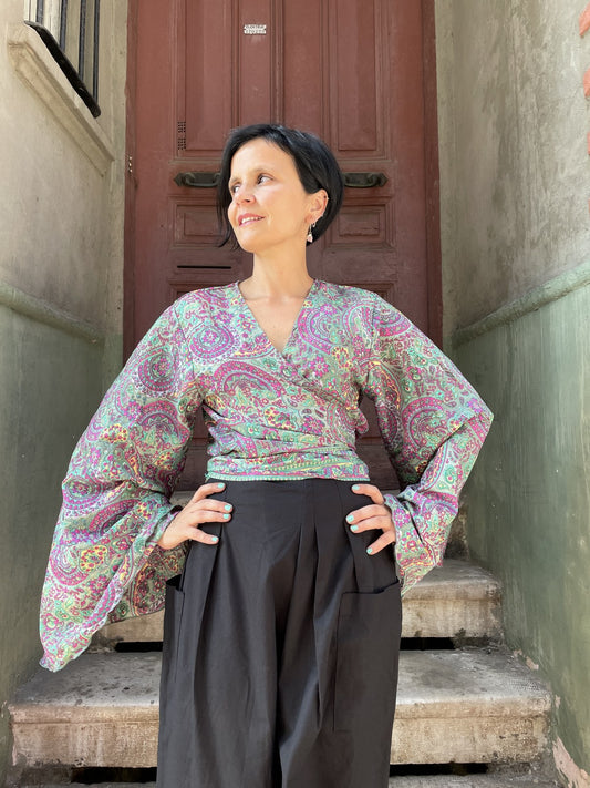 Bohem Müslin Yarasa Kol Bluz – Beyaz, Yeşil Hardal
