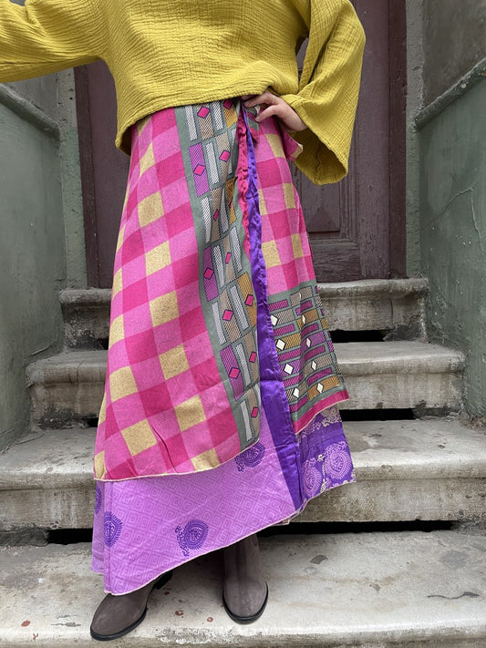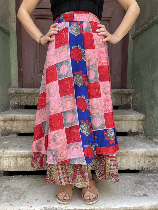 Bohem Pembe Kırmızı Çift Taraflı Bağlamalı İpek Etek