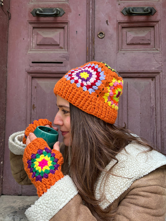 Bohem Patchwork El Örgüsü Bere Eldiven Takımı - Kiremit