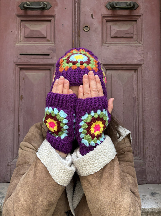 Bohem Patchwork El Örgüsü Bere Eldiven Takımı - Mor