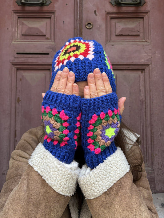 Bohem Patchwork El Örgüsü Bere Eldiven Takımı - Mavi