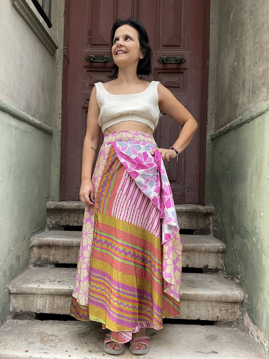 Bohem Pembe Çift Taraflı Bağlamalı İpek Etek