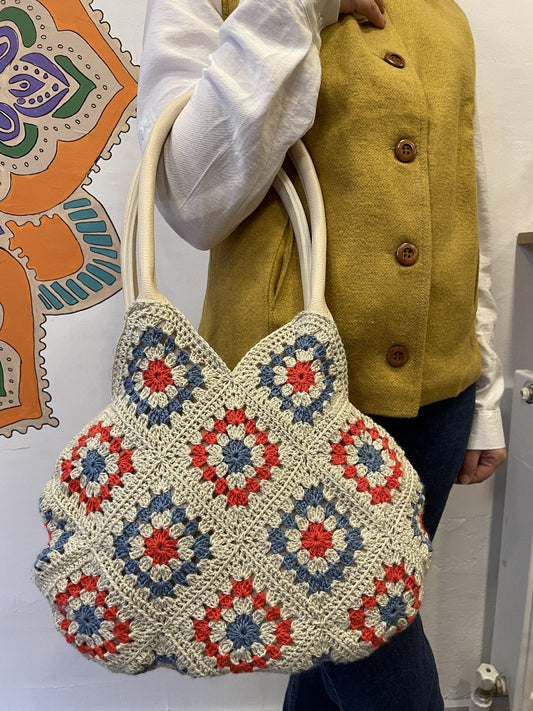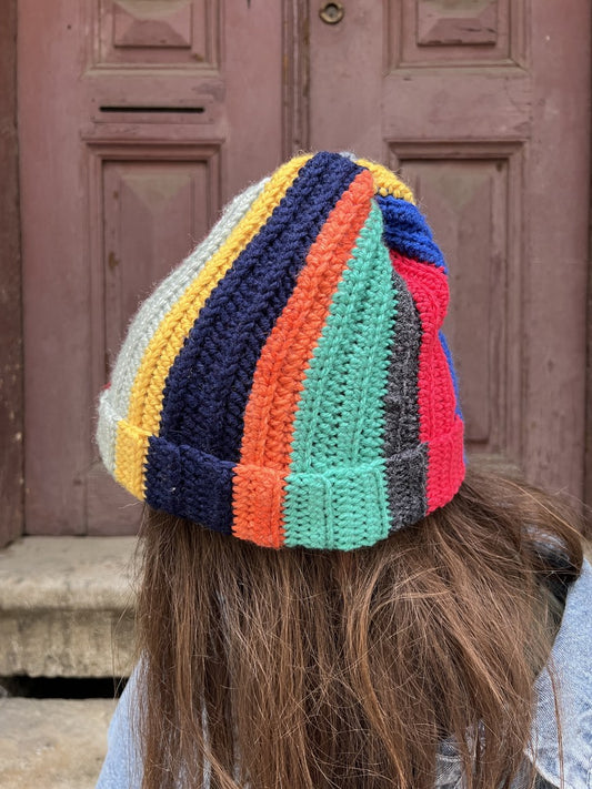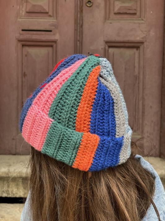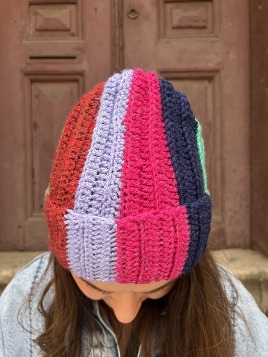 Bohem Patchwork El Örgüsü Bere – Renkli Çizgili - Kırmızı Mavi Pembe