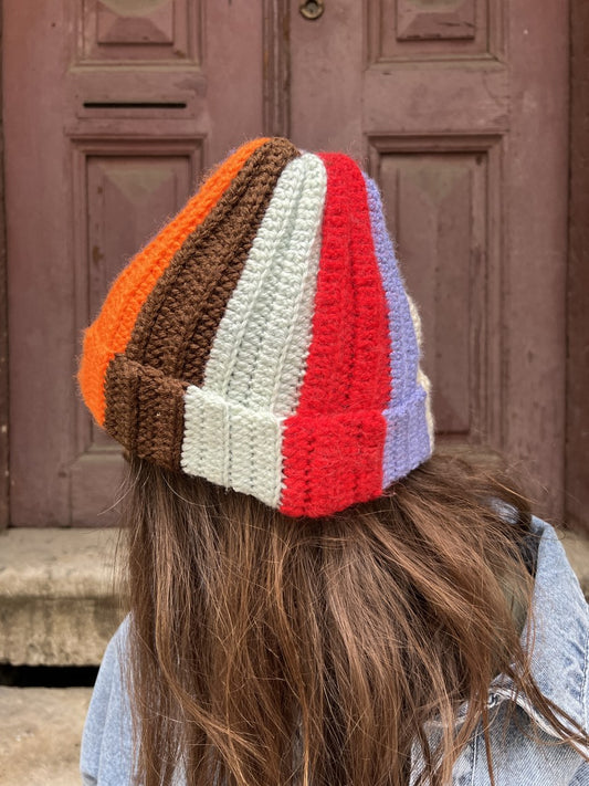 Bohem Patchwork El Örgüsü Bere – Renkli Çizgili - Kahve Turuncu Bej