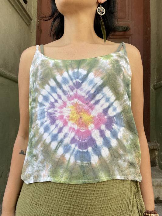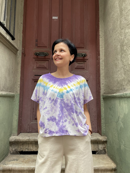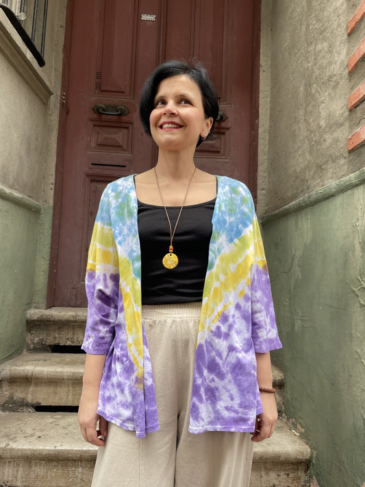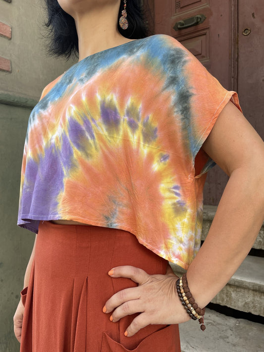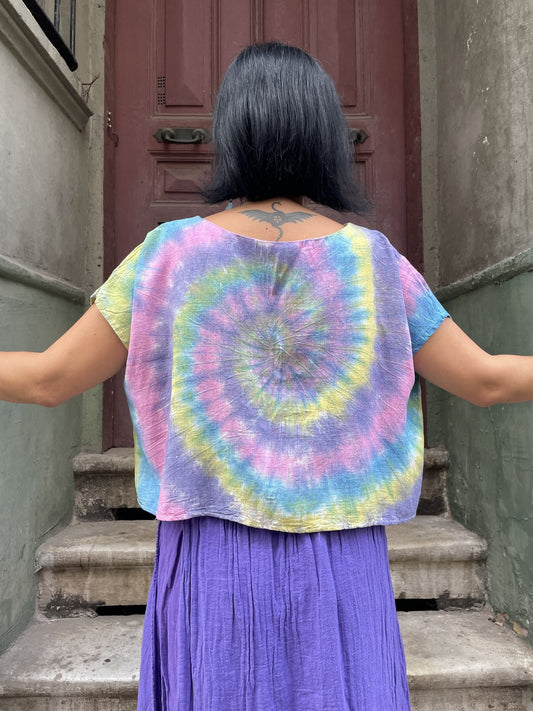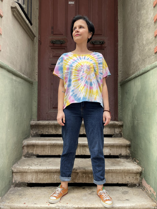 Batik Müslin Bluz – “Vortex” | El Boyaması, Renkli Spiral Desenli Bohem Tasarım