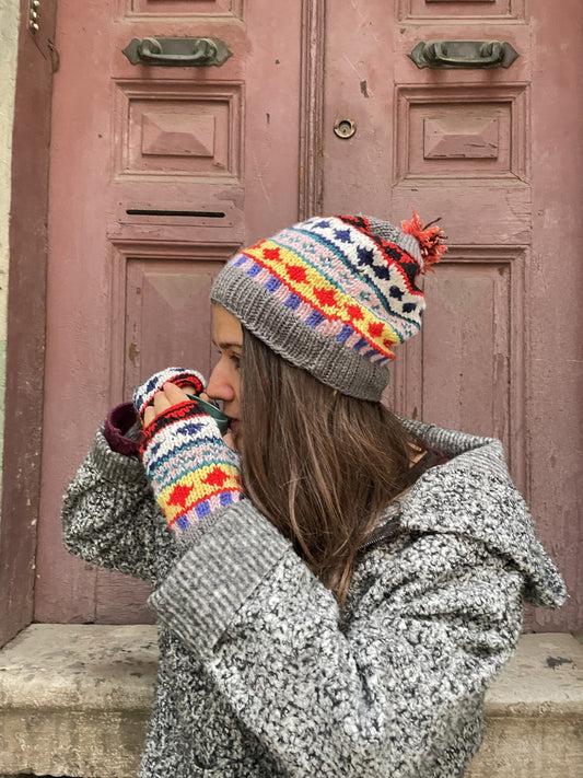 Bohem Antrasit Motifli Yün Bere Eldiven Takımı