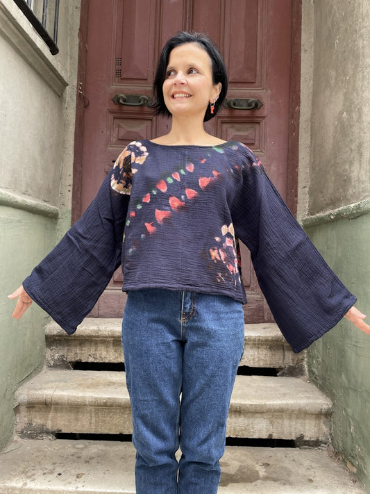 Batik Müslin Bluz – “Astra” – El Boyaması Lacivert Bohem Tasarım