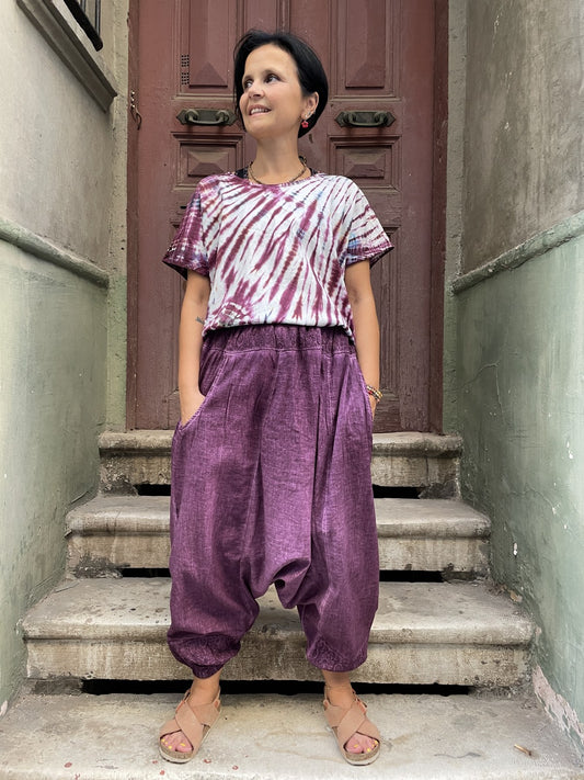 Kadın Nepal Mor Patchwork Şalvar Pantolon – Taşlanmış Kumaş, Bol Cepli, Salaş & Bohem Stil
