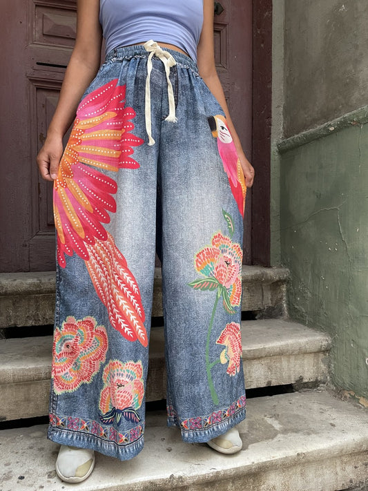 Bohem Kadın Jean Görünümlü Pantolon – Papağan ve Çiçek Desenli, Salaş Model