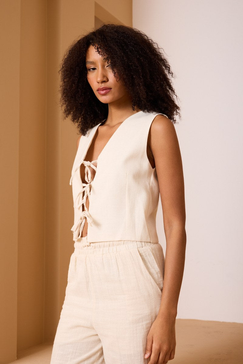 Bağcıklı Keten Kadın Ceket & Pantolon Takımı – Krem