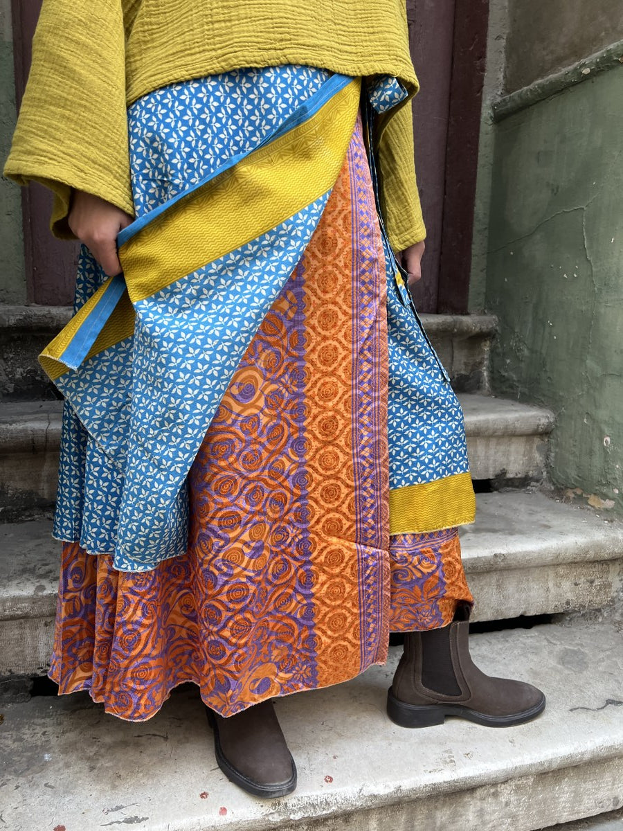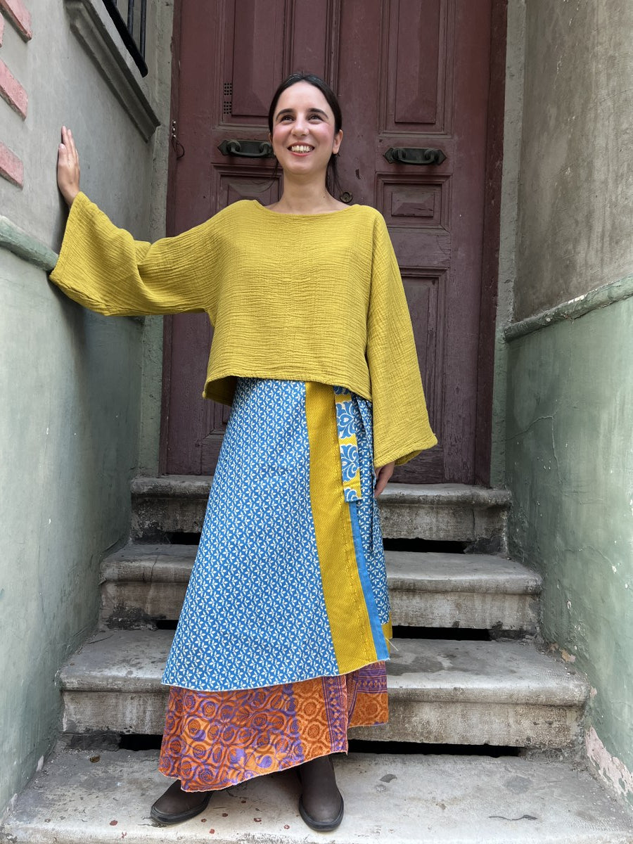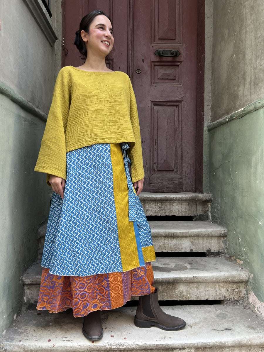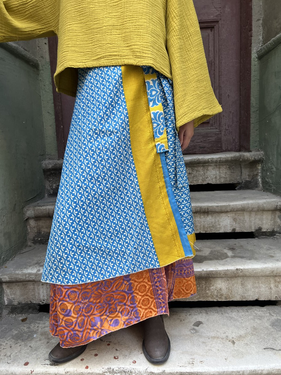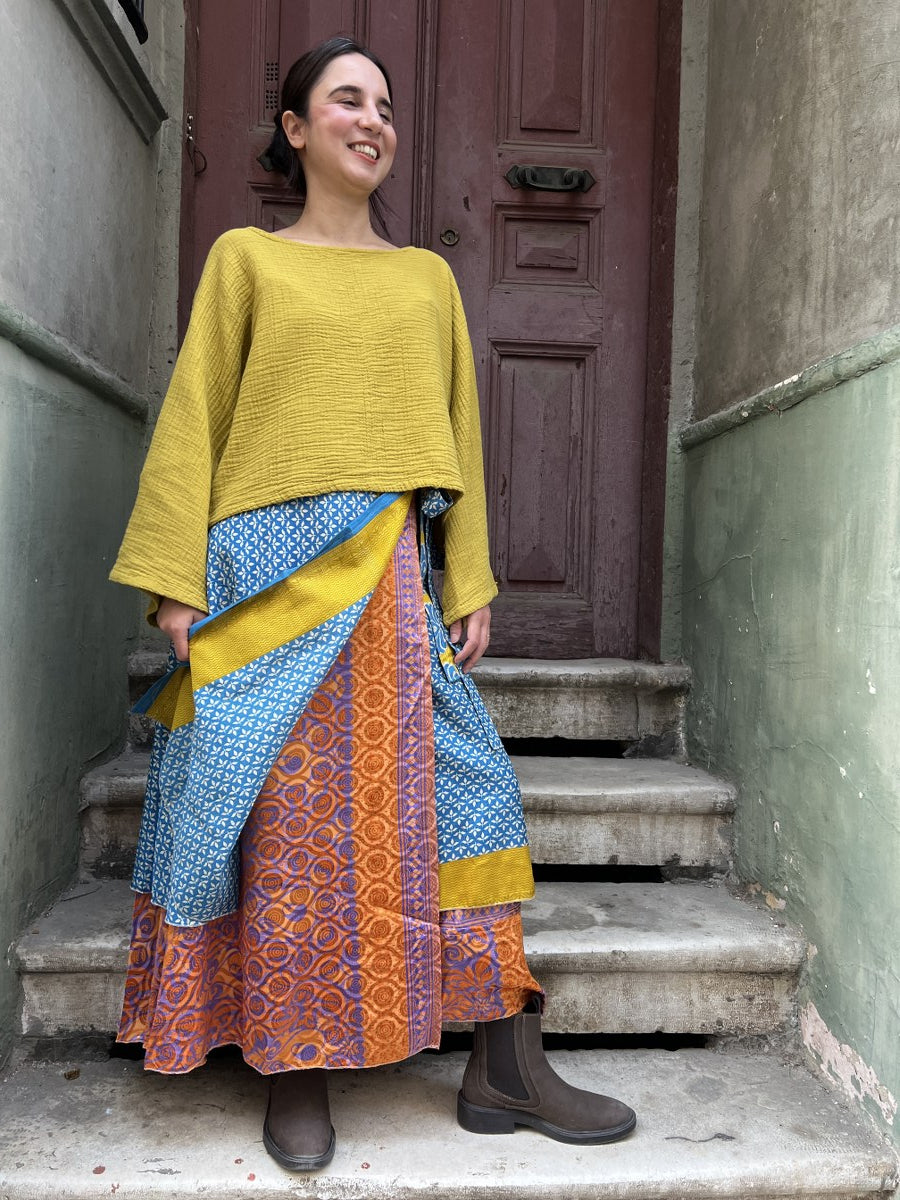 Doğanın enerjisi ve etnik desenlerle buluştu! Nepal’den gelen bu çift taraflı ipek etek, bir yüzünde zarif etnik desenlerle, diğer yüzünde ise canlı bir bohem stil sunar. Her biri el yapımı olan bu etekler sadece bir tane üretildi – çünkü senin kadar özel!