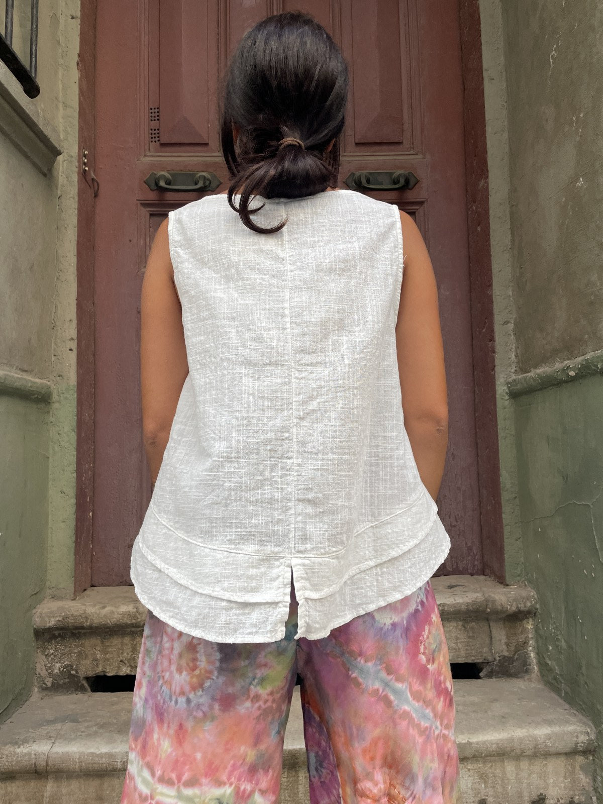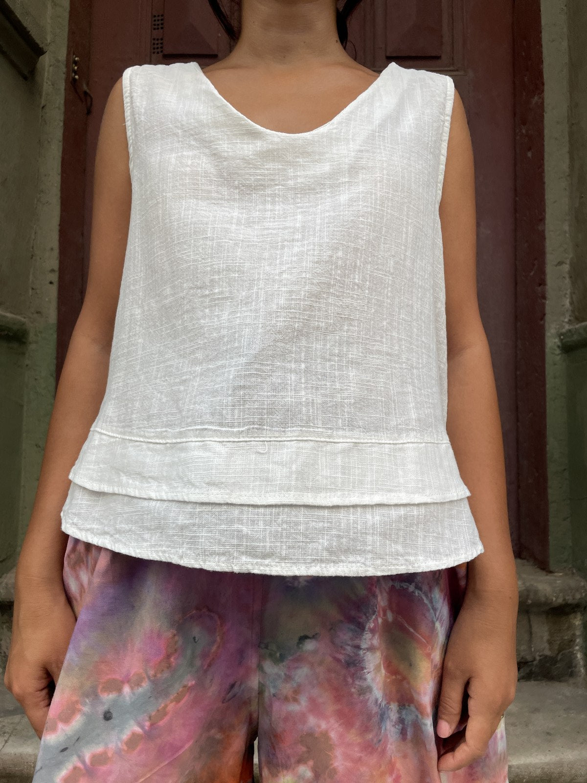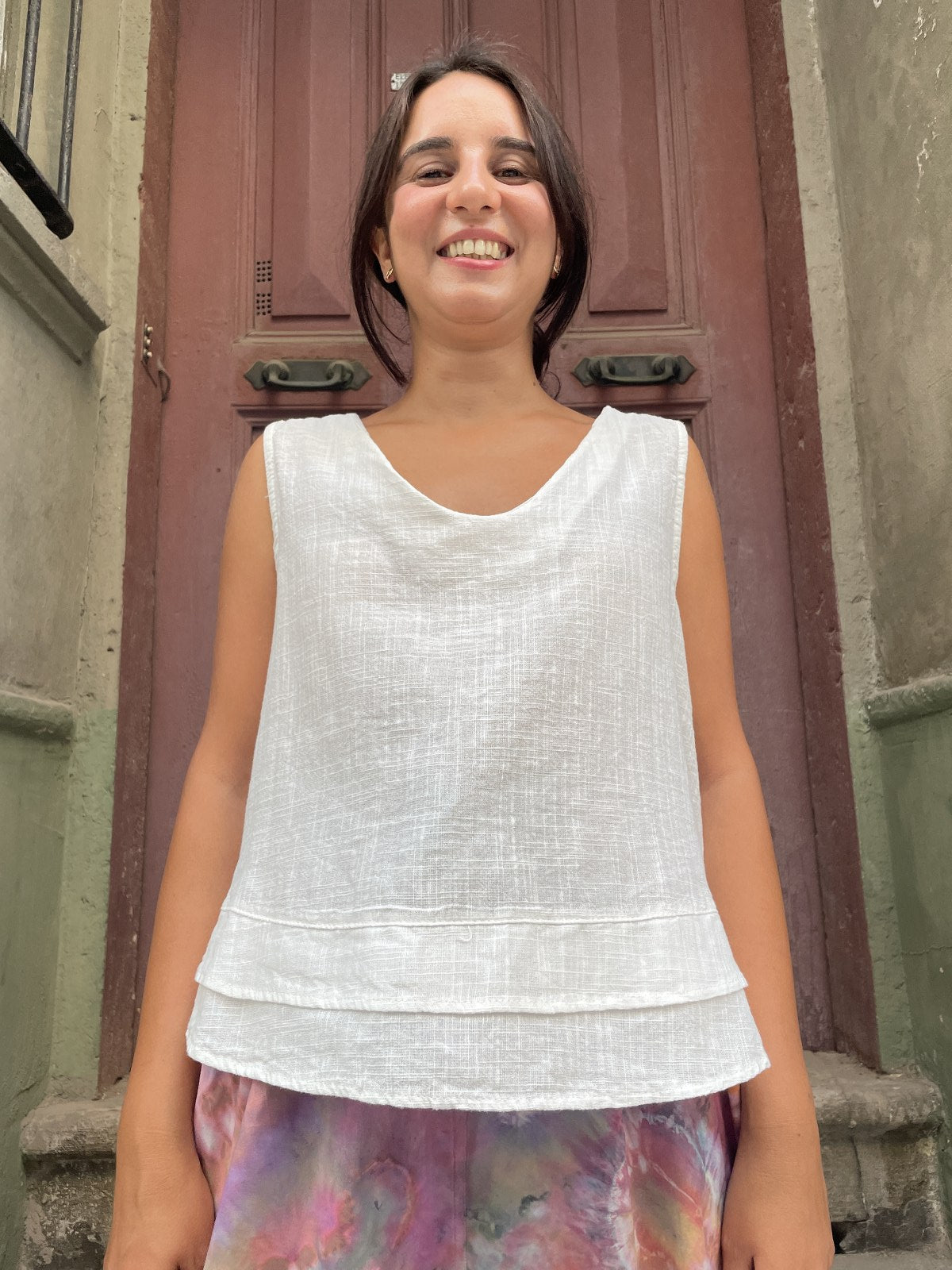 Bohem sadeliğini ve doğallığı yansıtan bu beyaz kolsuz bluz, %100 pamuk kumaşı sayesinde cildinize nefes aldırır. Salaş ve konforlu yapısıyla sıcak havalarda rahatlıkla tercih edilir. Alt kısmındaki katmanlı dikiş detayı, minimal tasarıma hareket kazandırır.