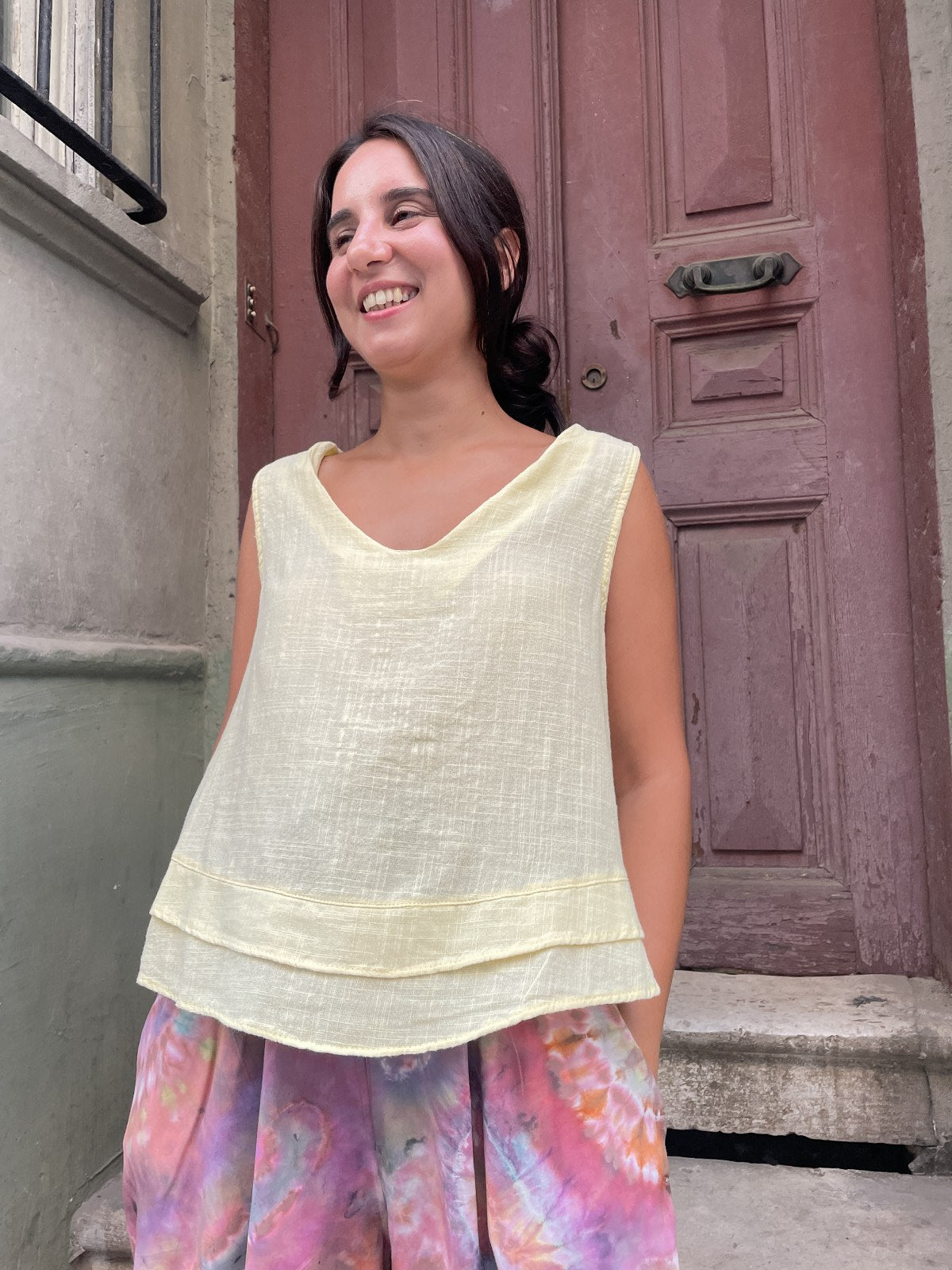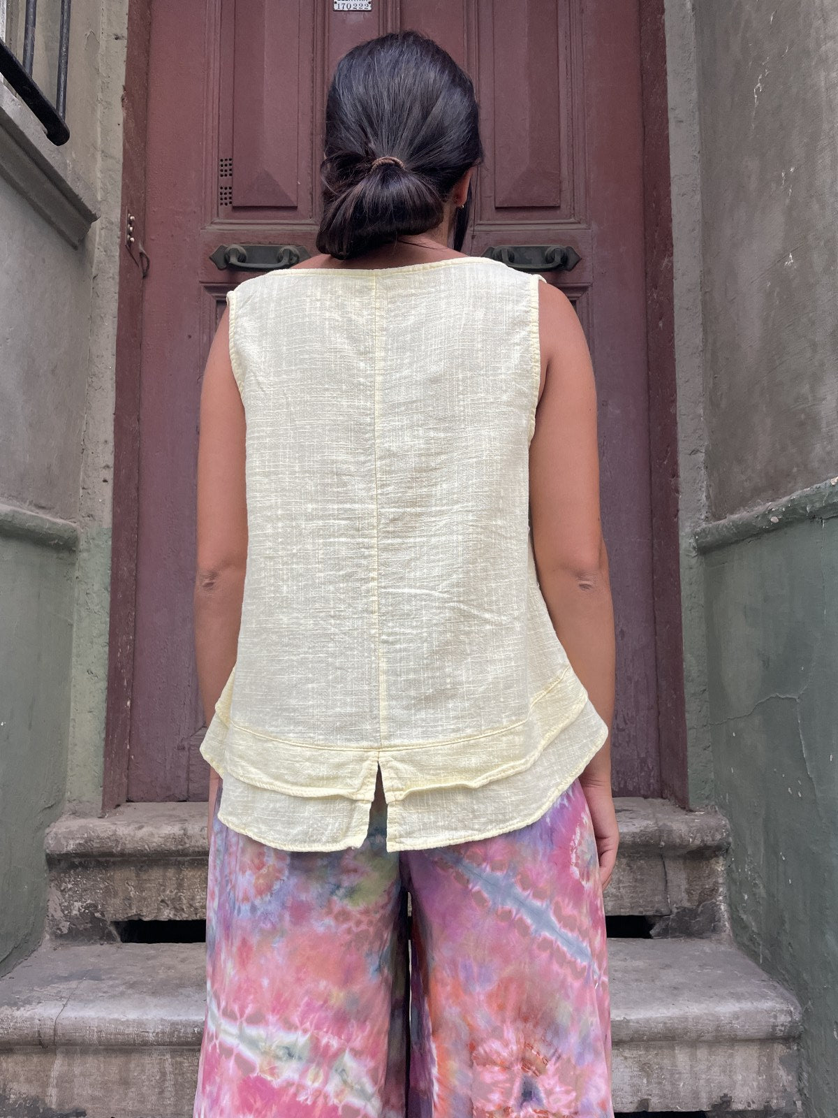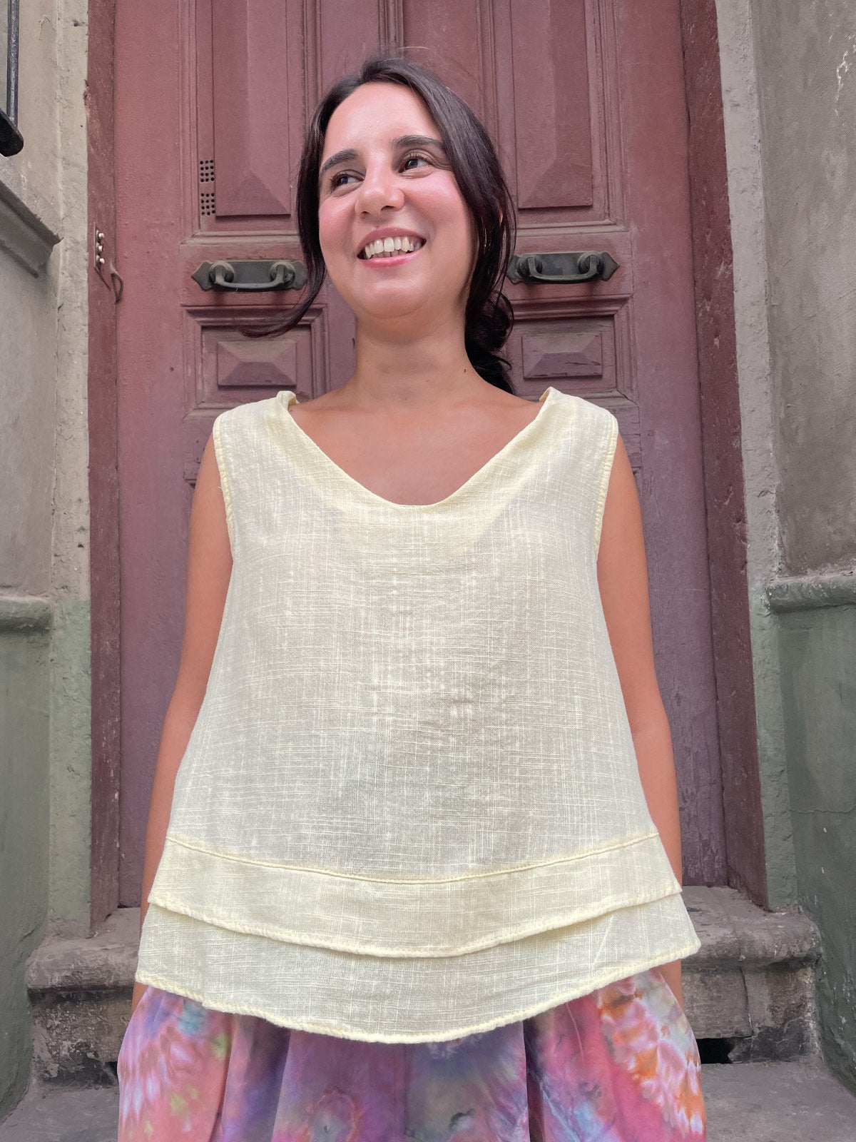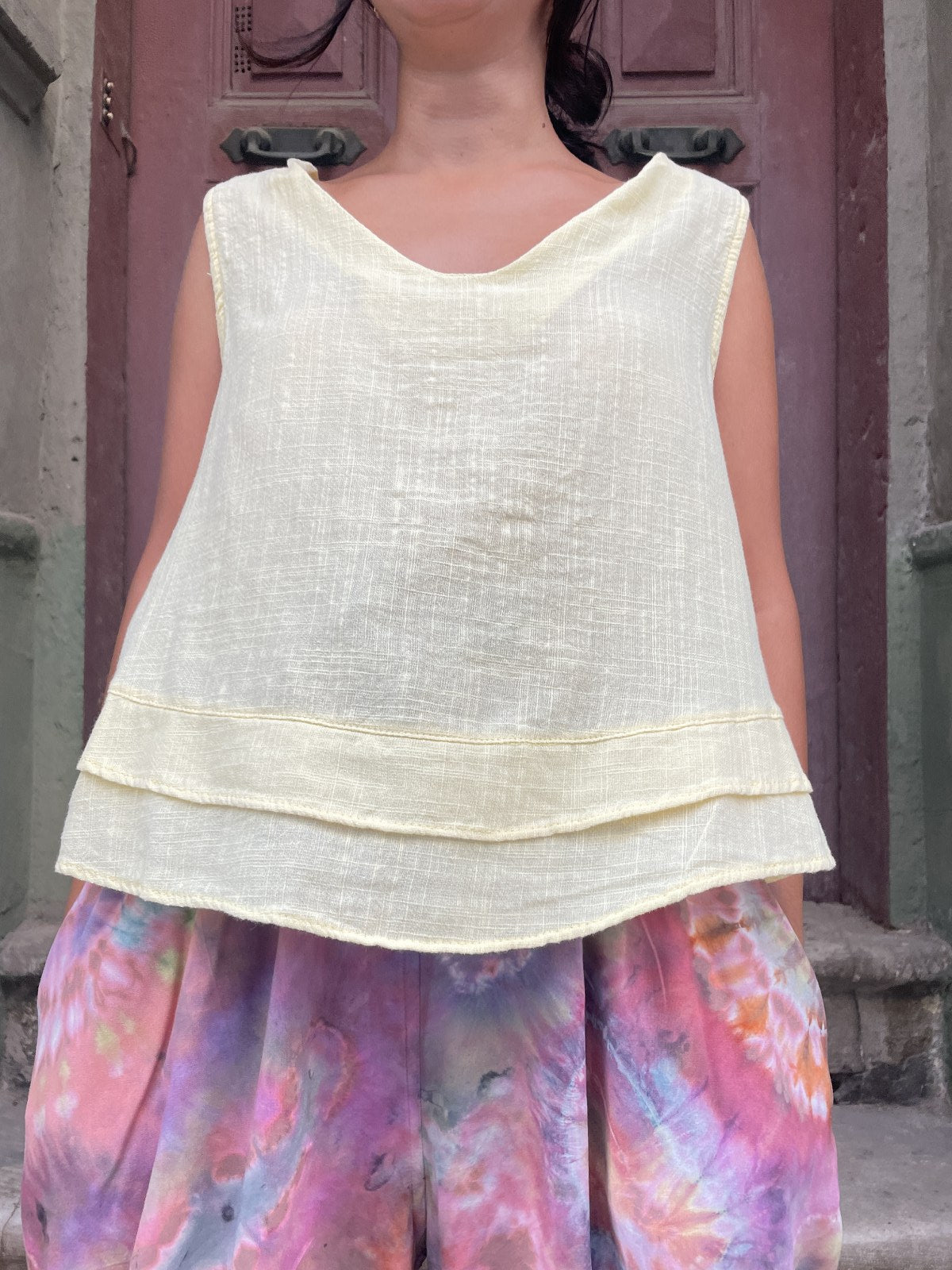 Bohem sadeliğini ve doğallığı yansıtan bu beyaz kolsuz bluz, %100 pamuk kumaşı sayesinde cildinize nefes aldırır. Salaş ve konforlu yapısıyla sıcak havalarda rahatlıkla tercih edilir. Alt kısmındaki katmanlı dikiş detayı, minimal tasarıma hareket kazandırır.
