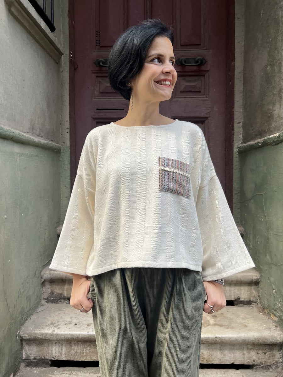 Ivoria, doğal fildişi tonundaki dokuma yüzeyi ve renkli patchwork mini ceple sade, zarif ve modern bir boho görünüm sunar.