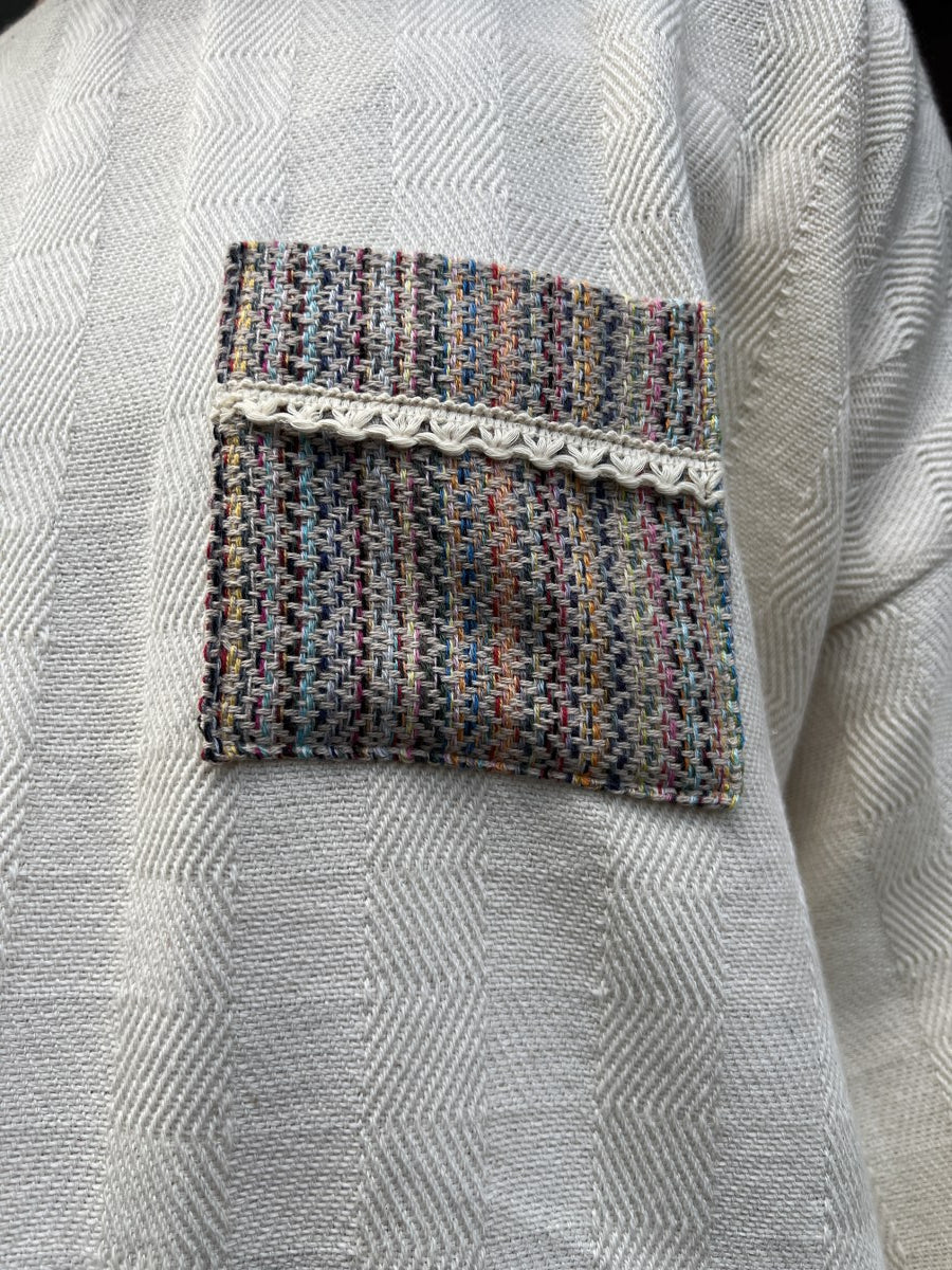 Doğal krem ton; hem modern hem de boho estetiğe uyum sağlar. Göğüsteki renkli patchwork mini cep ise tasarıma el işçiliği, karakter ve hikâye katar.