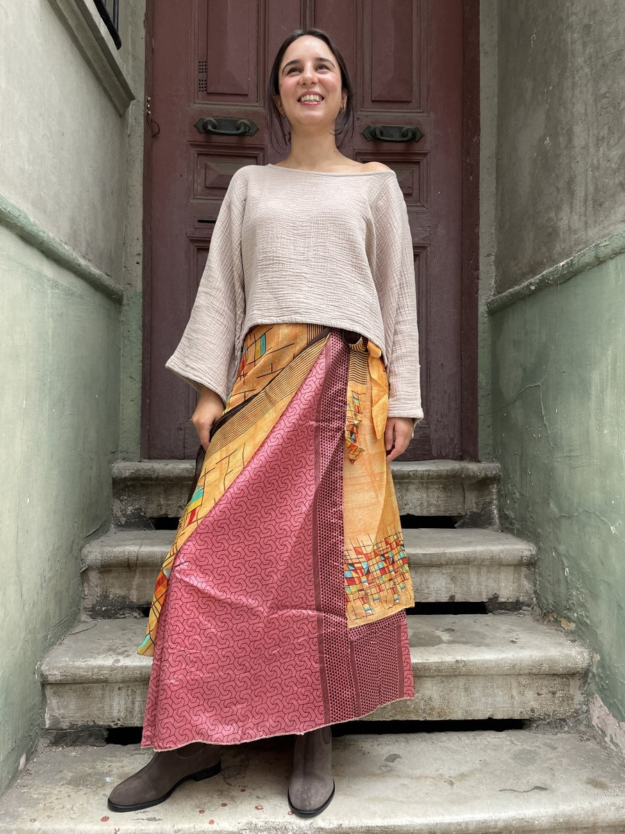 Nepal'den gelen bu el yapımı ipek etek, canlı yeşil ve kırmızı zemin üzerine işlenen renkli figürleriyle hem özgün hem de dikkat çekici bir parça. Eteğin iç yüzünde yer alan farklı desenler sayesinde çift taraflı kullanım sunar. Sanatsal dokunuşlarla zenginleştirilen bu tasarım, geleneksel Nepal motiflerini modern bohem bir stille buluşturur. Her biri tek ve sana özel olarak üretildi.