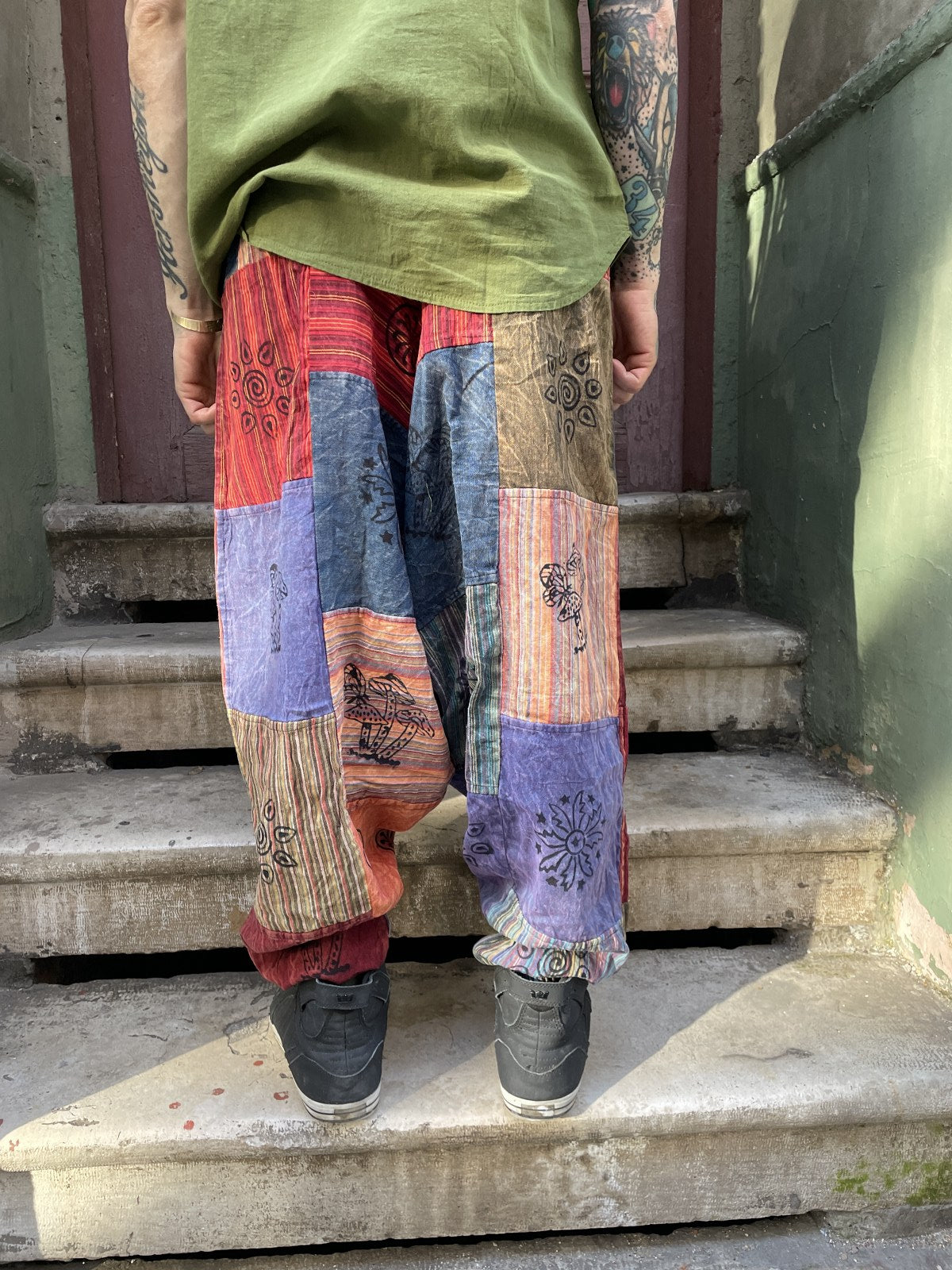 Unisex Nepal Bej Mor Renkli Patchwork Festival Şalvar Pantolon, Boho Yaşam’ın rahat ve salaş şalvar koleksiyonunun en tercih edilen parçalarından sadece bir tanesi.