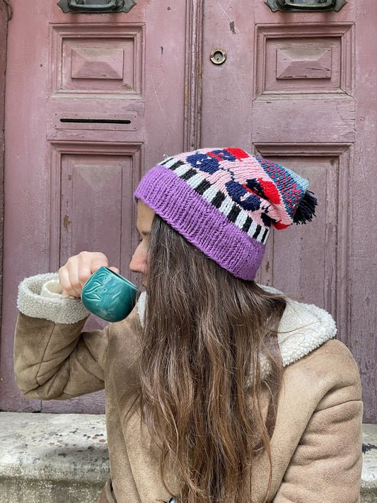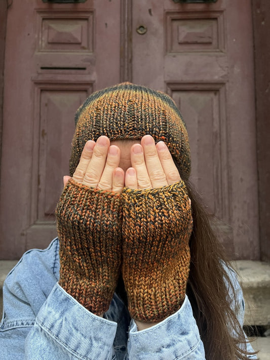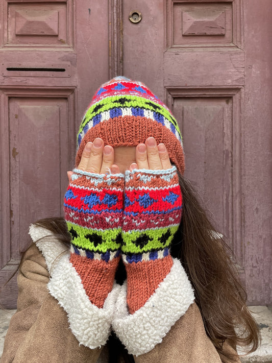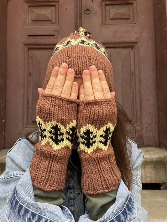 Bohem Kahve Motifli Yün Bere Eldiven Takımı