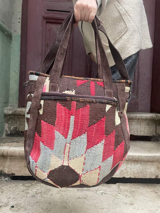 Bohem Kahve Mavi Pembe Kilim Omuz Çantası