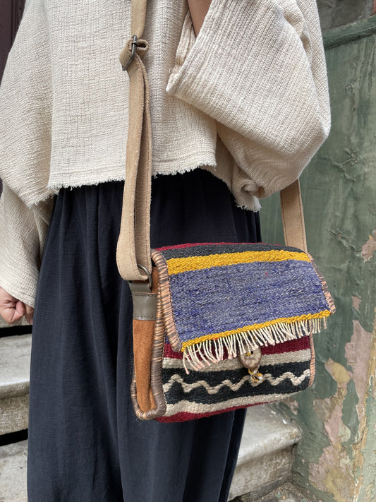 Bohem Mor Bordo Desenli Deri Kilim Omuz Çantası