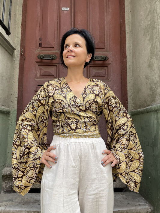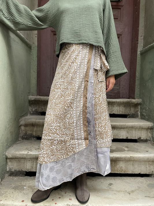 Bohem Nepal Çift Taraflı Desenli Bağlamalı İpek Etek -Bej