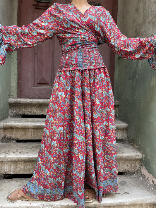 Bohem Nepal Bordo Desenli Bağlamalı İpek Etek