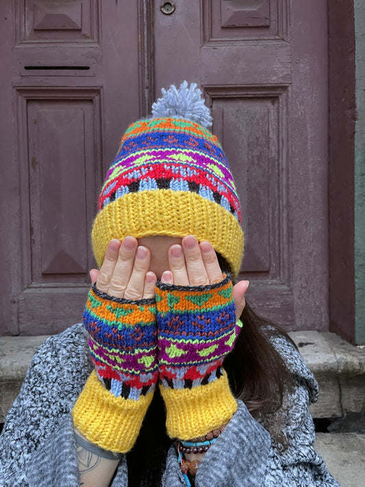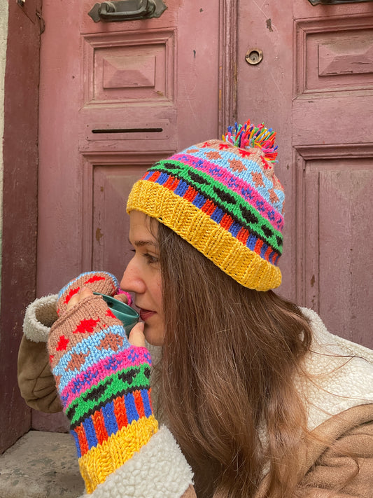 Bohem Sarı Motifli Yün Bere Eldiven Takımı