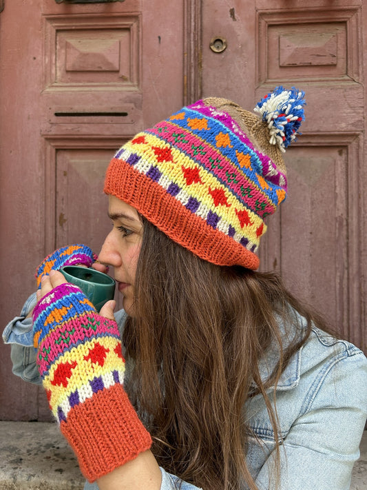 Bohem Tarz El Örgüsü Bere ve Eldiven Seti - Yün-Pamuk Karışımı Kışlık Aksesuar - Kiremit