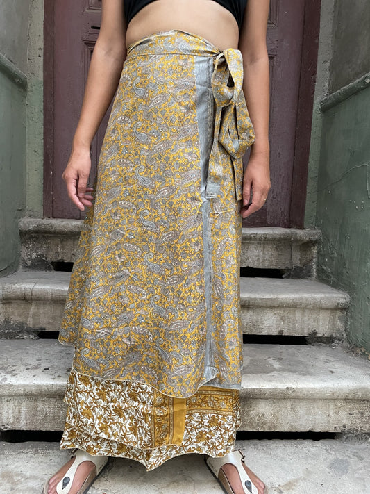 Çift Taraflı Nepal Bohem İpek Etek – Sarı ve Gri Desen