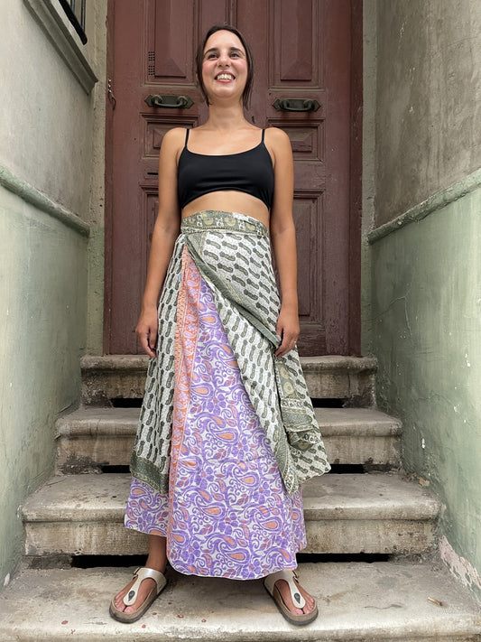 Çift Taraflı Nepal Bohem İpek Etek – Yeşil Beyaz & Lila Turuncu Desenli