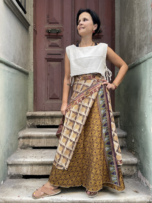 Çift Taraflı Kahverengi Bohem İpek Bağlamalı Etek – El Yapımı