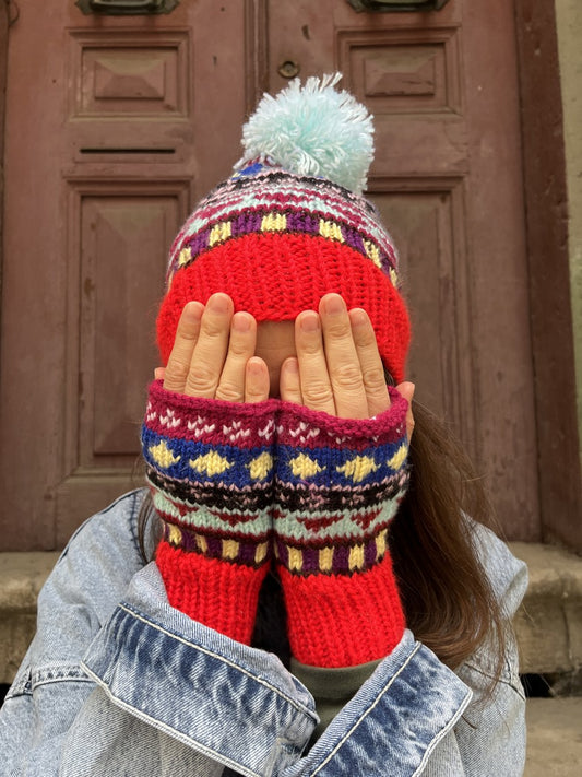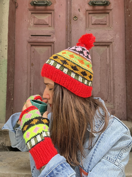 El Örgüsü Kadın Bere ve Eldiven Seti - Bohem Stil Renkli Kış Aksesuarı - Kırmızı Renkli