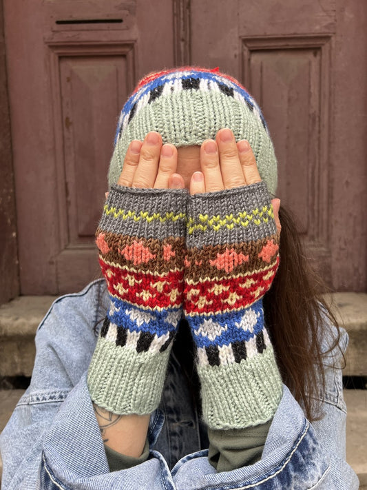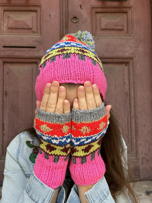 El Örgüsü Renkli Desenli Bere ve Parmaksız Eldiven Takımı - Etnik Boho Tarz - Pembe