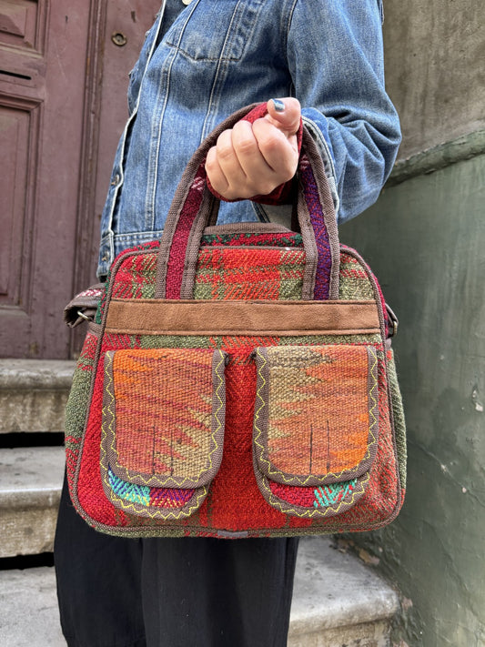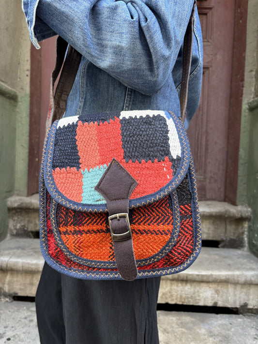El Yapımı Kilim Çanta - Ayarlanabilir Saplı, Etnik Tasarım - Kareli