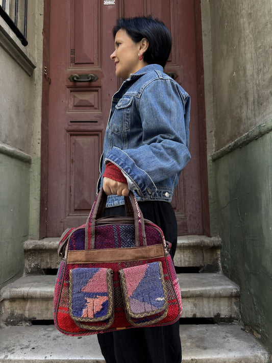 El Yapımı Patchwork Kilim Çanta - Mor Kırmızı