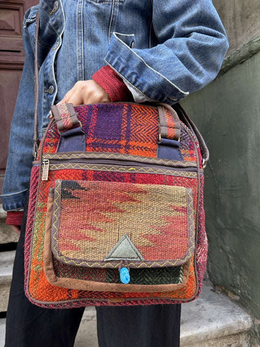 El Yapımı Kilim Çanta - Ayarlanabilir Saplı, Etnik Tasarım - Turuncu Mor