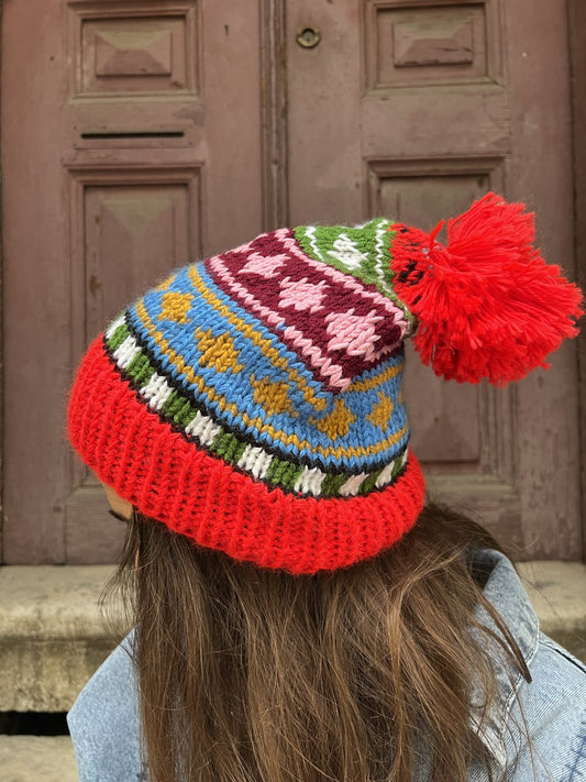 El Yapımı Renkli Bohem Bere Eldiven Takımı – Kışlık Örgü Desenli Kadın Bere- Kırmızı