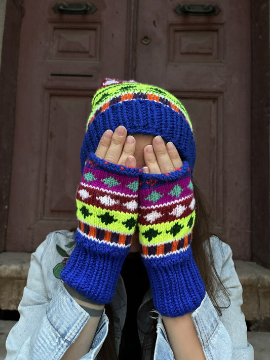 El Yapımı Renkli Bohem Bere Eldiven Takımı – Kışlık Örgü Desenli Kadın Bere- Saks